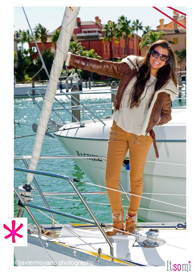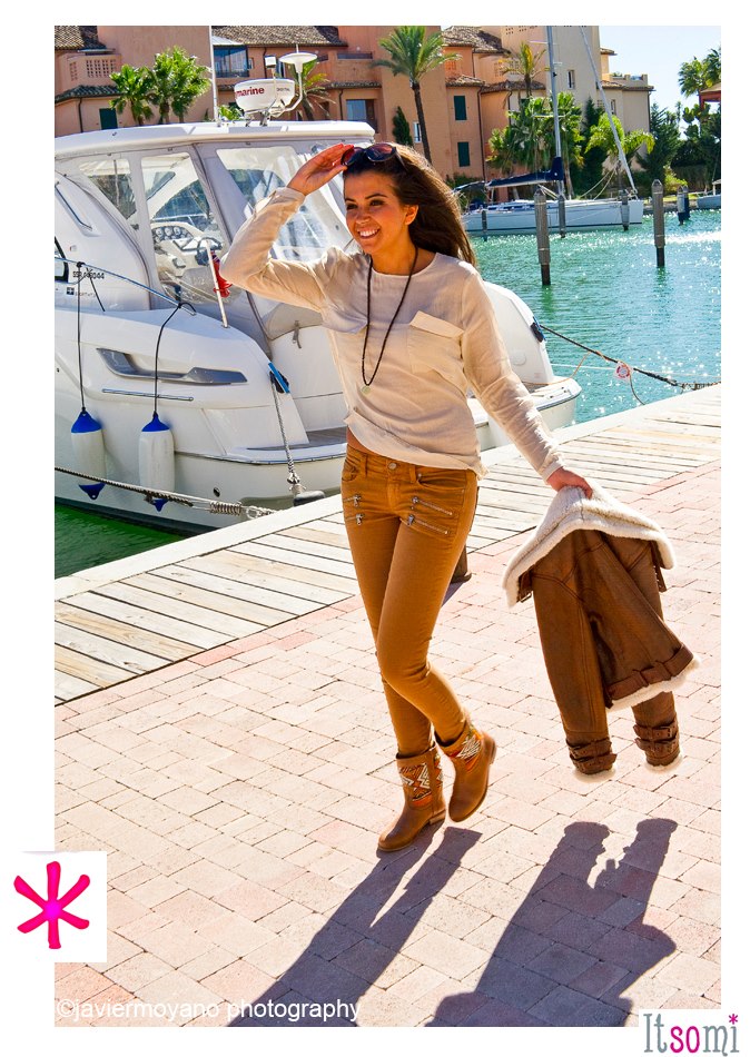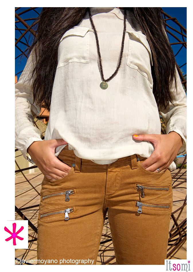 aviator jacket from SAGA IBAÑEZ, a nice silk beige shirt from POE and the latest zipped PAIGE jeans in one of the most popular color for the autumn/winter. HOWSTY boots of course and a necklace from LES NEREIDES.